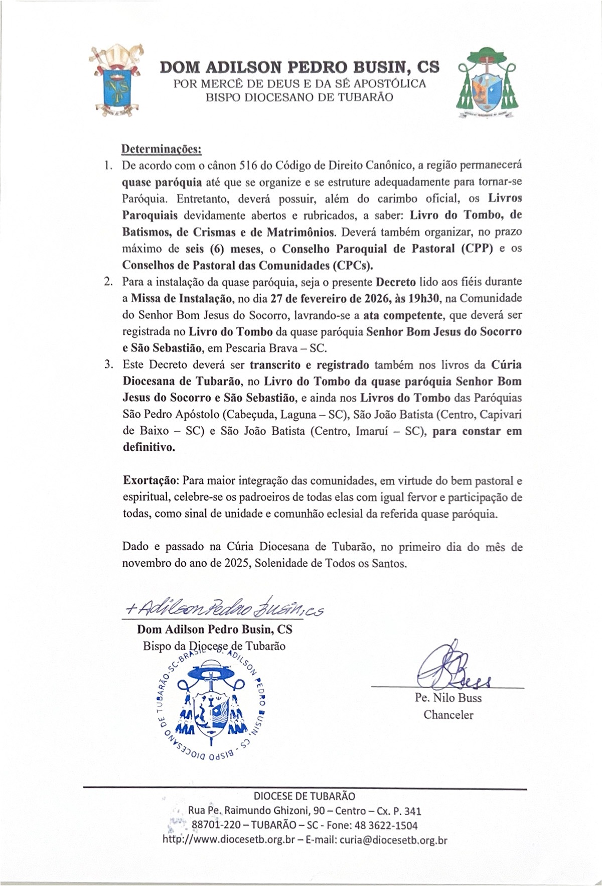 Decreto - Criação da Paróquia Senhor Bom Jesus do Socorro e São Sebastião, em Pescaria Brava/SC